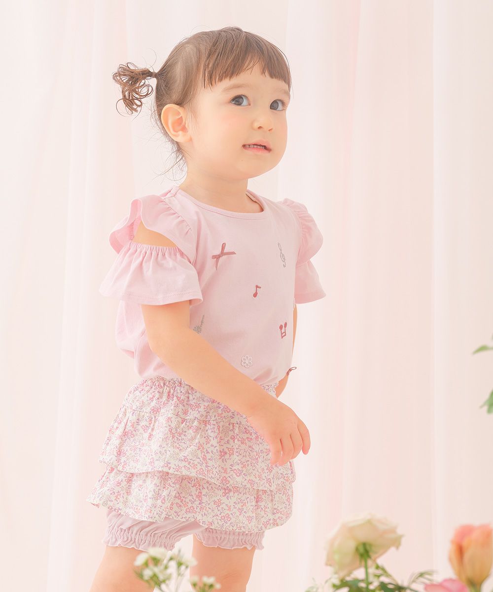 綿100%音符刺繍 肩あきフリル袖Tシャツ Pink model image 1