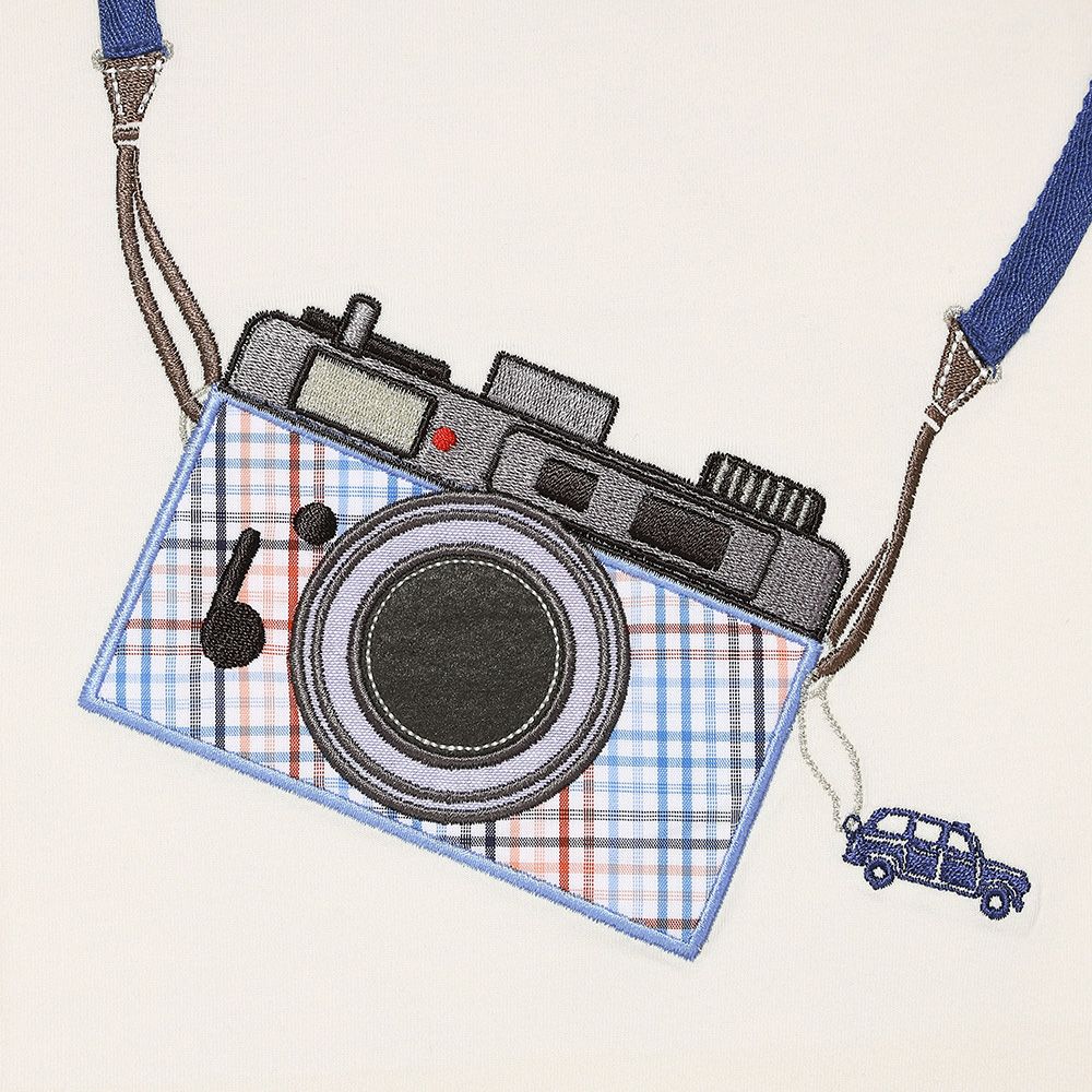 綿100% チェック柄カメラモチーフ 車刺繍Tシャツ Ivory Design point 1