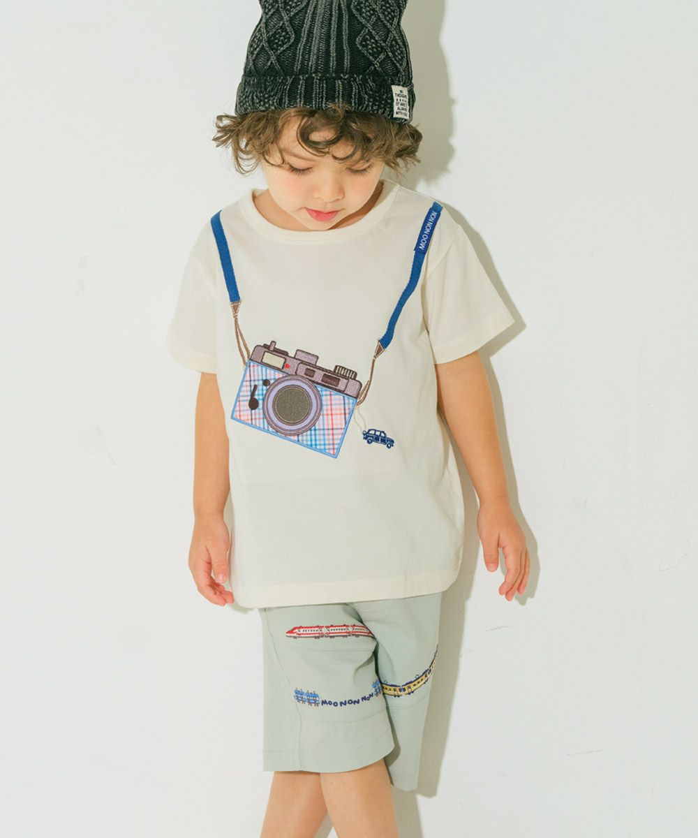 綿100% チェック柄カメラモチーフ 車刺繍Tシャツ Ivory front